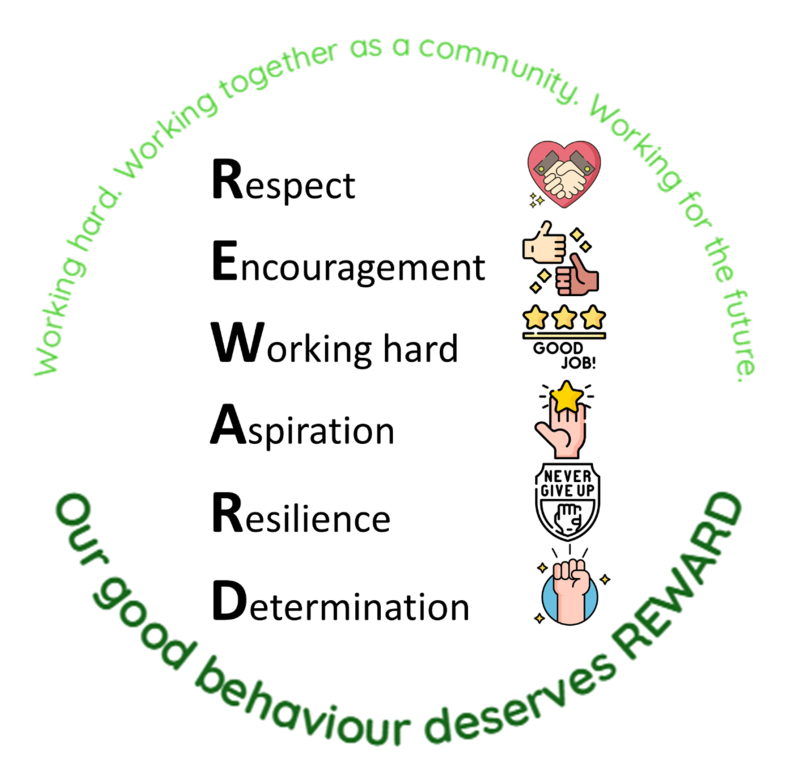 Our values are captured in the acronym REWARD - Respect, Encouragement, Working hard, Aspiration, Resilience, and Determination. We believe that good behaviour and commitment to these values should be recognised, and we celebrate this through our housepoint system, where students can earn badges, prizes and recognition for embodying our values.